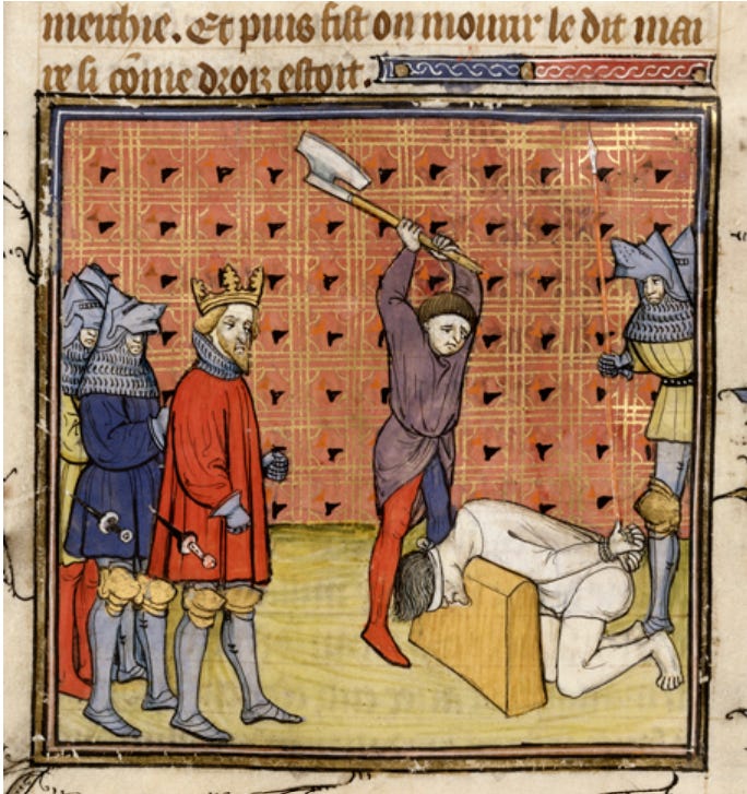 In this context, ‘without battle’ means without the process of revenge that comes with general homicide (Marsden 2015). Two things are established here. First, that there are reciprocal bonds of service between lords and their “men.” Second, that infractions against either party in this context can allow for violence without retribution by the state. This is violence not in absence of law, but in acceptance of law. Now let’s consider another law: